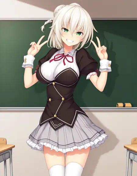 outfit01, black sleeve, puffy sleeves, short sleeve, sleeve tie, wrist cuffs, 2 buttons on cuff, bustier, black bustier, white line trimmed bustier, 4 buttons, shirt, white shirt, collared shirt, loop tie, red loop tie, skirt, gray skirt, pleated skirt, white frill trimmed skirt, thighhighs, white thighhighs, zettai ryouiki,
