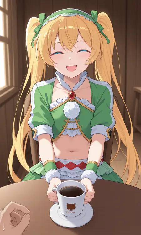 popo_sg, twintails, midriff, blond hair blue eyes, headdress,
