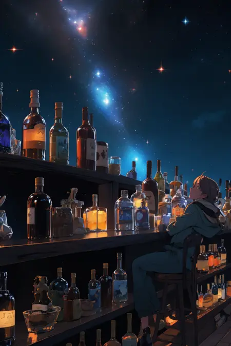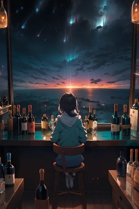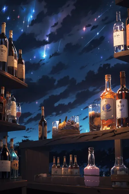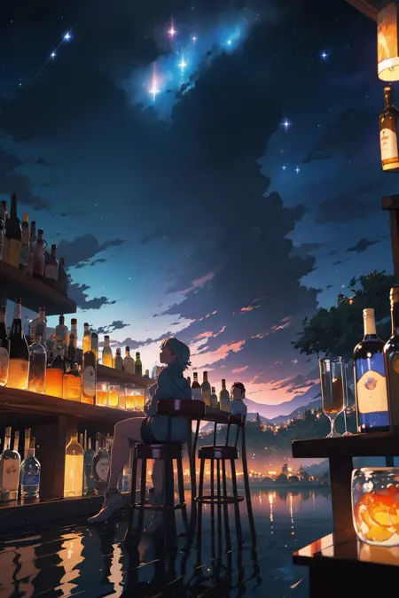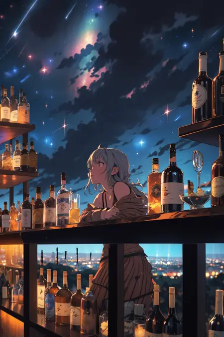 이는 이전의 바 스타일과 강렬한 대비를 이루는 또 다른 바 테마입니다. 별하늘, 도시, 바라는 세 가지 요소를 학습시켜, 바 풍경과 야외 풍경이 더 잘 어우러지도록 했습니다.