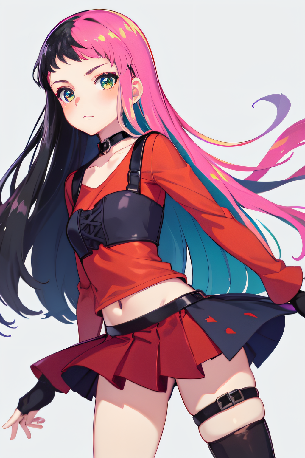 推奨されるプロンプト: , (多色の髪、ストライプ模様の髪、ピンクの髪、黒の髪)、非常に長い髪、緑の目