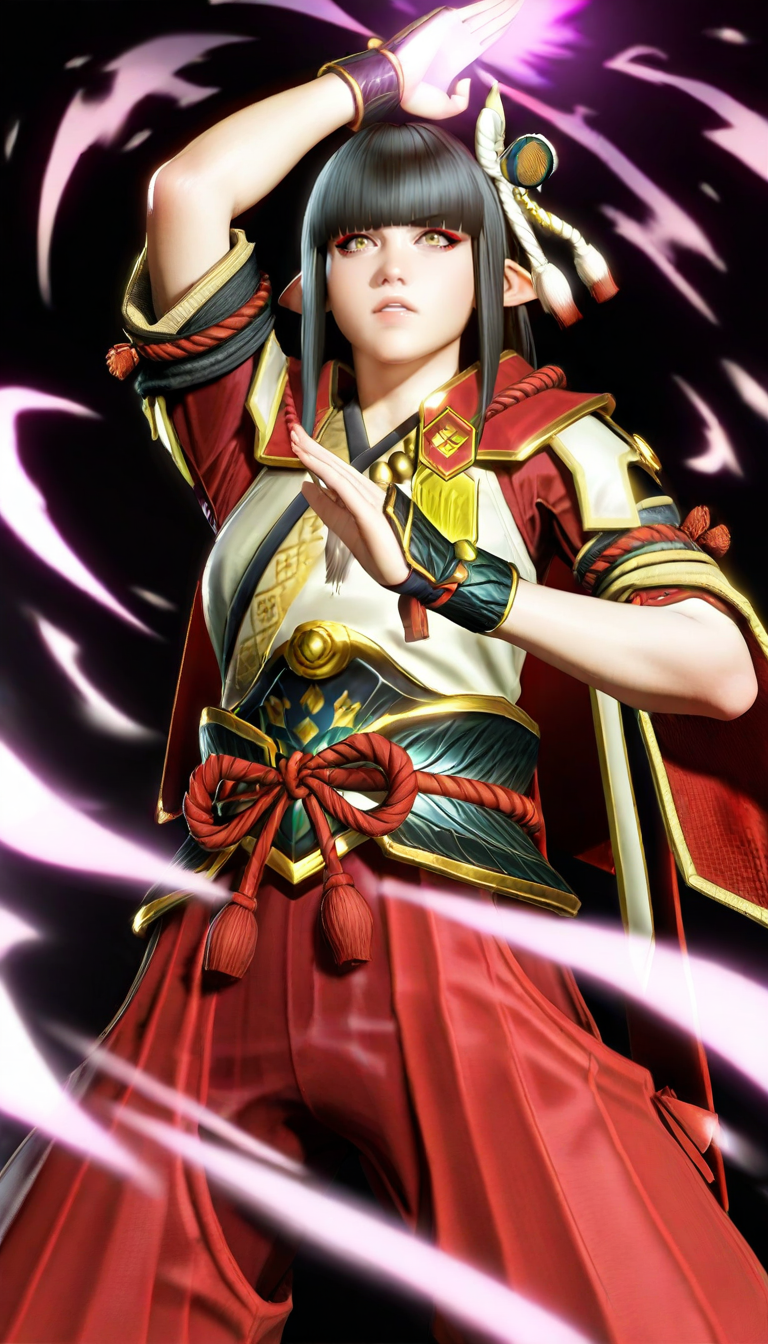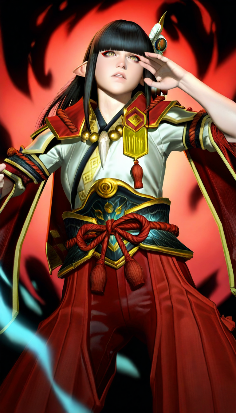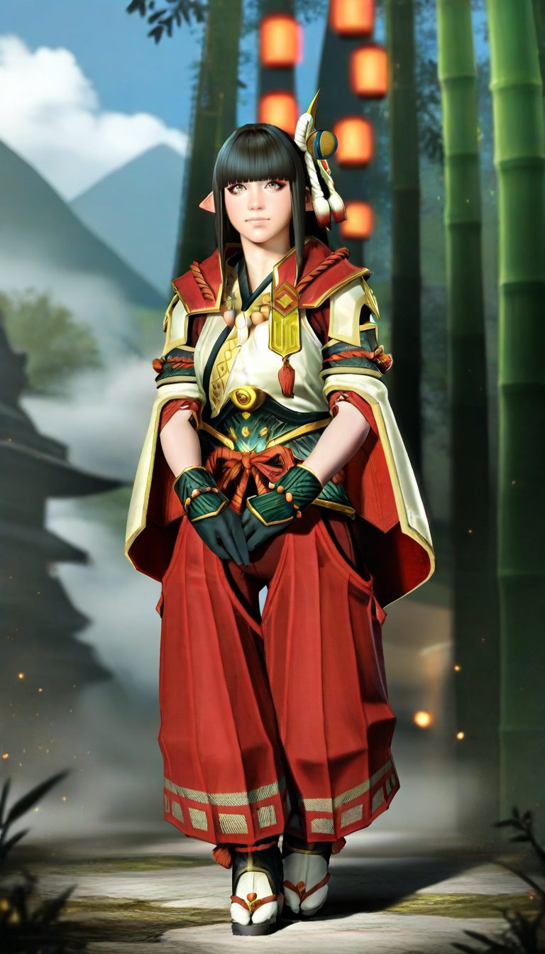 mhhinoa, realistic, 1girl, solo, black hair, long hair, blunt bangs, hair ornament, yellow eyes, pointy ears, red and white short cape, shoulder necklace, white robe top, deep red undershirt, green waist armor, detached sleeves, red cut out pants, deep red pants underneath, black fingerless gloves, 4 fingers, white tabi sock, black footwear,