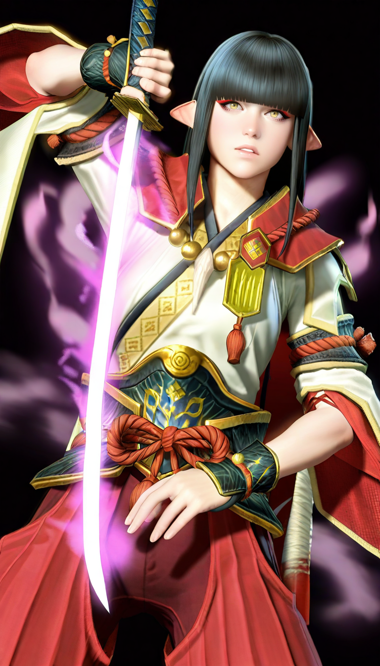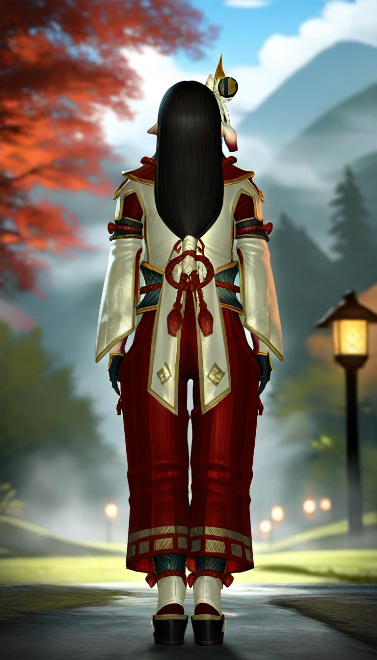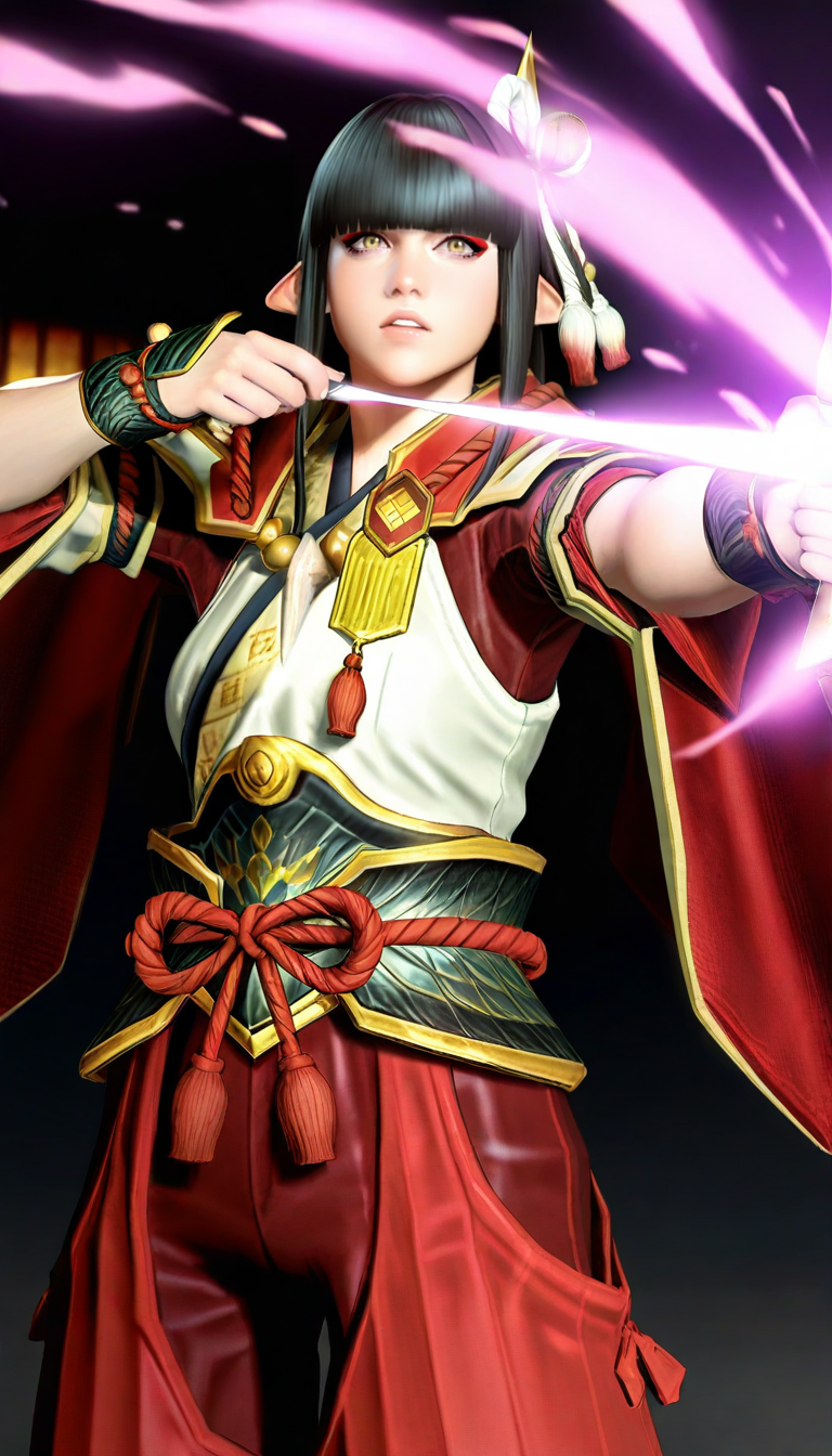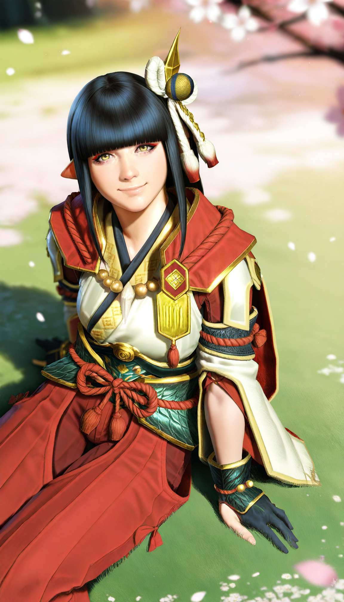 mhhinoa, realistic, 1girl, solo, black hair, long hair, blunt bangs, hair ornament, yellow eyes, pointy ears, red and white short cape, shoulder necklace, white robe top, deep red undershirt, green waist armor, detached sleeves, red cut out pants, deep red pants underneath, black fingerless gloves, 4 fingers, white tabi sock, black footwear,