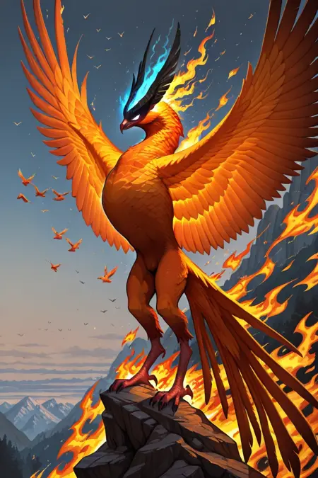 Phoenix,furry,tail,wings,thick thighs,glowing,feathers,feathered wings,claws,wide hips,convenient leg,beak,bird tail,winged arms,talons