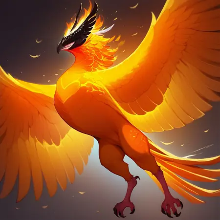 인조 불사조, 불타는 깃털로 이루어진 몸체, 날개와 꼬리에 빛나는 숯덩이 무늬, 녹은 금색 눈, 매끄럽고 근육질의 조류 체형, 어깨에서 뻗어나온 큰 깃털 날개, 갈퀴가 달린 날개 달린 팔, 불꽃 끝이 된 꼬리 깃털, 타는 깃털로 이루어진 우아한 머리 뾰족이