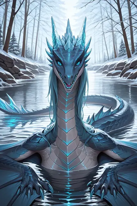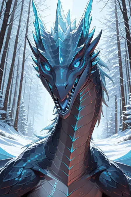 Winter Wyvern,wyvern,sharp teeth,scales,spikes,colored skin,light glow,blue eyes,light blue hair,wings