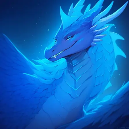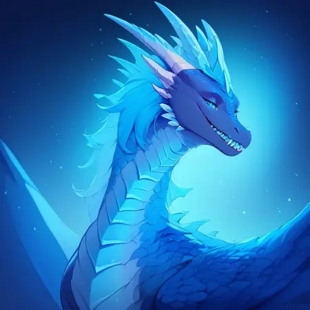 Winter Wyvern,wyvern,sharp teeth,scales,spikes,colored skin,light glow,blue eyes,light blue hair,wings