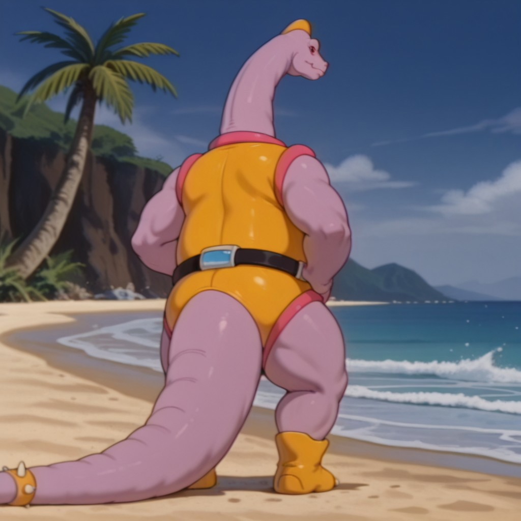 yellow bodysuit, pink trim, black belt, yellow boots, spiked tail ring,