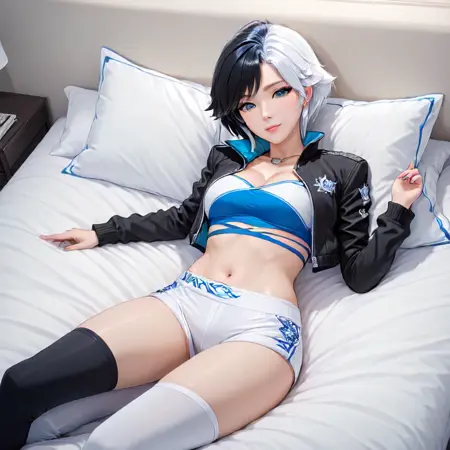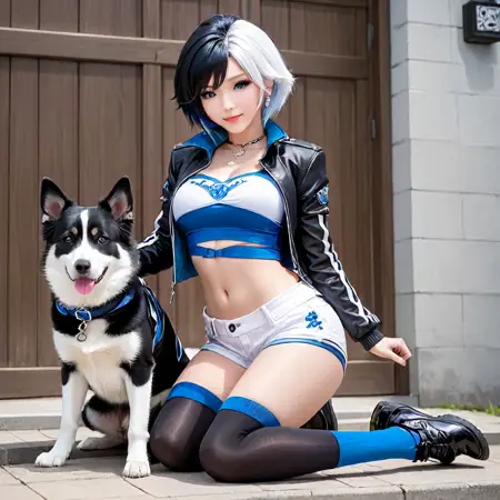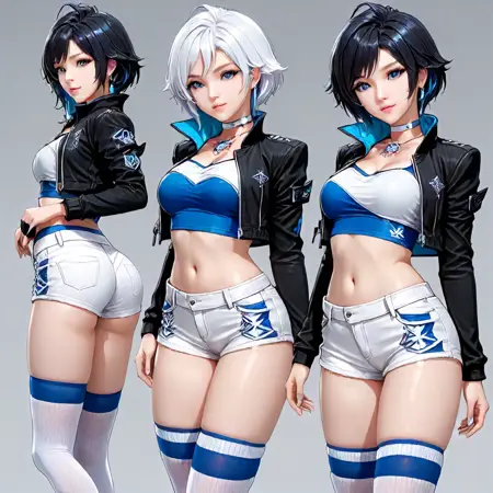 建议词汇:“双色头发、虹膜异色症、蓝眼睛、橙色眼睛、黑色夹克、露脐、蓝白上衣、过膝袜、黑发、白发、白色短裤”,