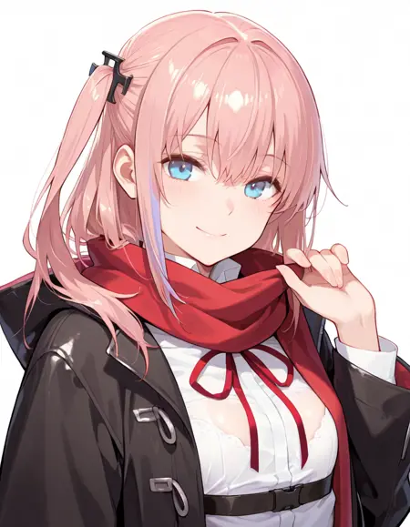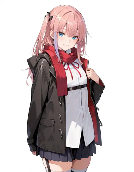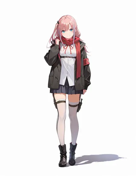 LiteraryGirl, LG_shirt, LG_shirt_strap, scl_neck_ribbon, one side up, LG_scarf, LG_hooded_jacket, LG_hair_ornament, LG_shirt, LG_thighhighs, LG_skirt, LG_thigh_strap, LG_thigh_holster, LG_boots
