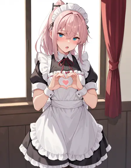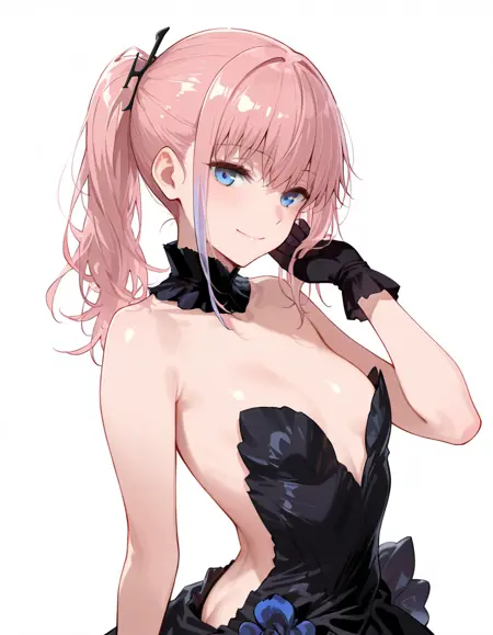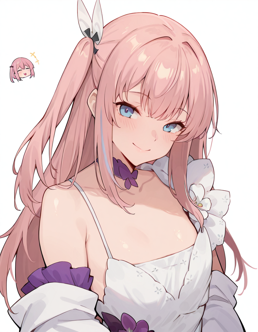 분홍색 머리, 파란 눈, 긴 머리, 한쪽만 위로 올린 머리, 줄무늬 머리, 작은 가슴