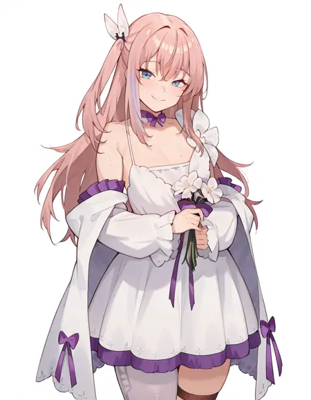 pink hair, blue eyes, long hair, ponytail, small breast, streaked hair