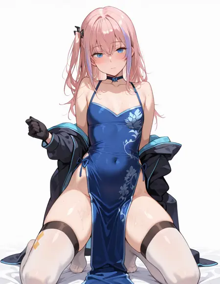 분홍색 머리, 파란 눈, 긴 머리, 포니테일, 작은 가슴, 줄무늬 머리