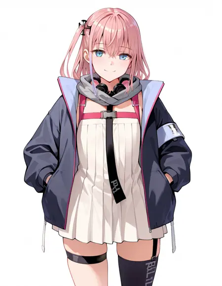 AR15MOD3, layered clothes, MOD3_vest, white vest, MOD3_jacket, black jacket, MOD3_dress, pink dress, MOD3_chest_strap, uneven legwear, MOD3_thighhighs, MOD3_gloves, MOD3_thigh_holster, MOD3_thigh_strap, MOD3_battle_mask, MOD3_hair_ornament, black footwear