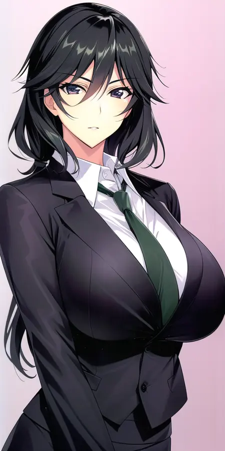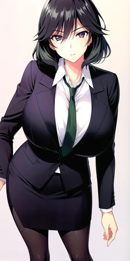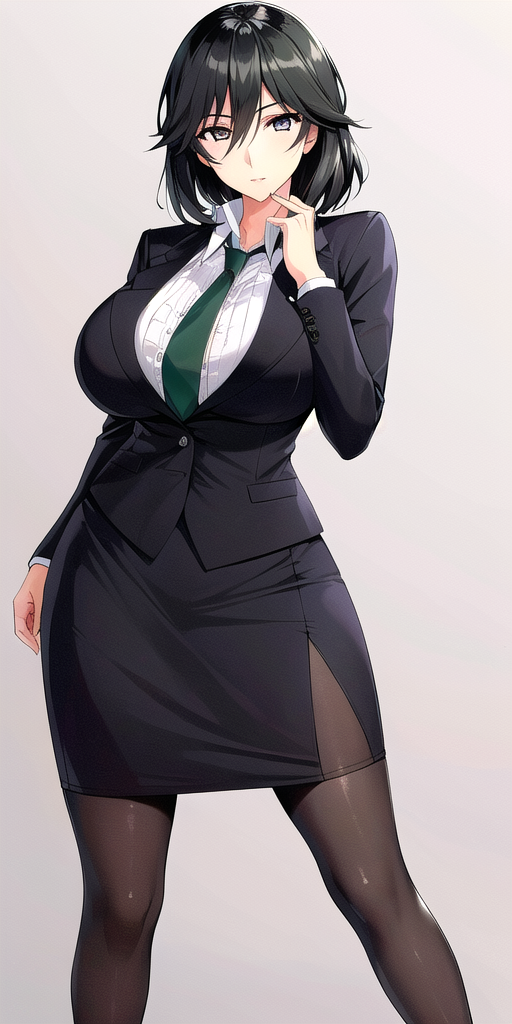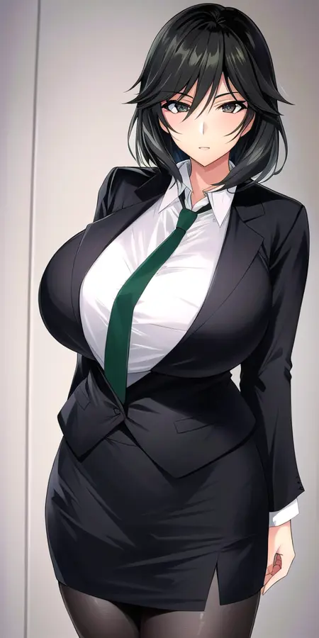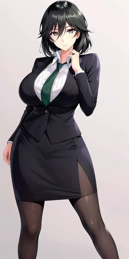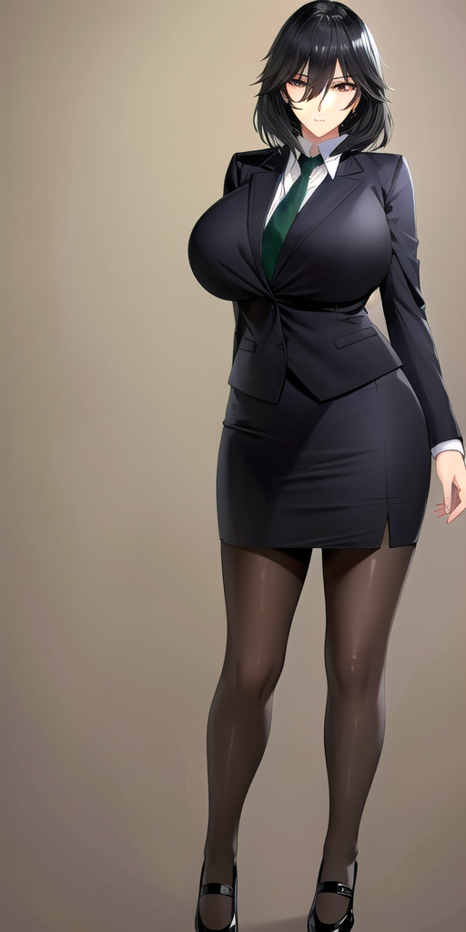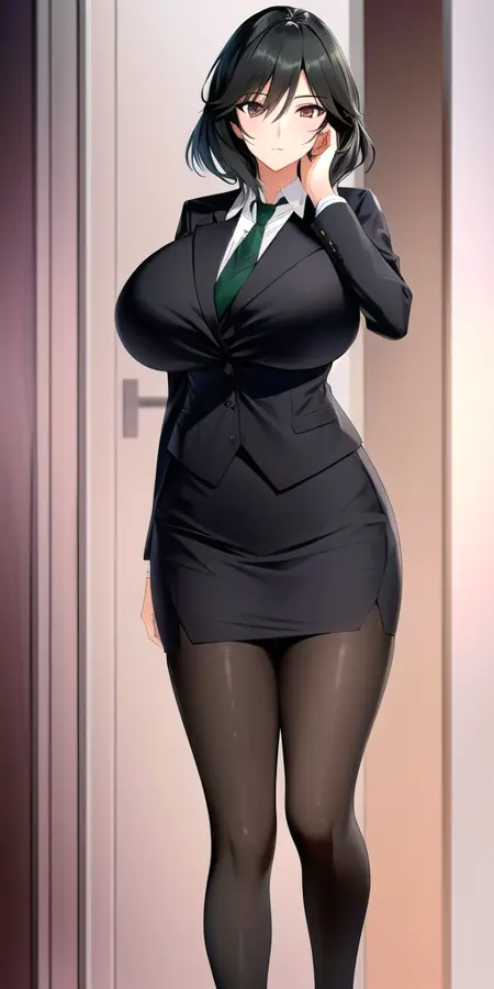 - Black_skirt_suit_Black_pantyhose_Green_necktie: her standard outfit.