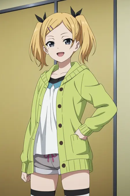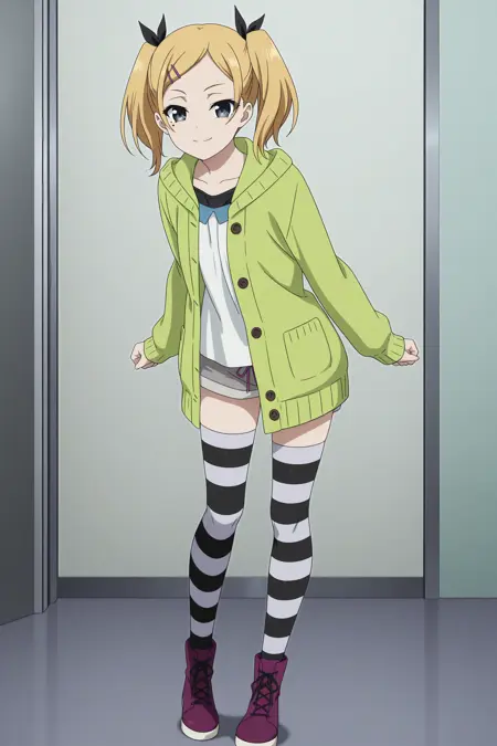 yano erika, 단발, 금발, 짧은 트윈테일, 헤어 리본, 헤어 클립, 갈라진 앞머리, 검은 눈, 눈 밑 모반, 긴 소매, 녹색 카디건, 여는 카디건, 후드 달린 카디건, 동물 귀 후드, 흰색 셔츠, 회색 반바지, 줄무늬 허벅지 스타킹, 보라색 신발, 하이탑