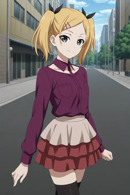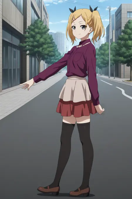 yano erika, 단발, 금발, 짧은 트윈테일, 헤어 리본, 헤어 클립, 갈라진 앞머리, 검은 눈, 눈 밑 모반, 긴 소매, 보라색 셔츠, 칼라 있는 셔츠, 옷 컷아웃, 견갑골, 갈색 치마, 빨간 치마, 계층적인 치마, 검은 허벅지 스타킹, 갈색 신발, 메리 제인
