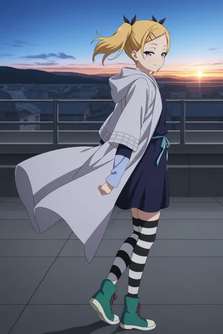 yano erika, 단발, 금발, 짧은 트윈테일, 헤어 리본, 헤어 클립, 갈라진 앞머리, 검은 눈, 눈 밑 모반, 3/4 소매, 회색 코트, 후드 달린 코트, 긴 코트, 긴 소매, 파란색 드레스, 허리 리본, 줄무늬 허벅지 스타킹, 녹색 신발, 하이탑
