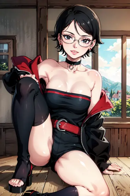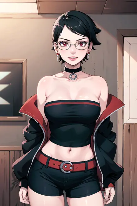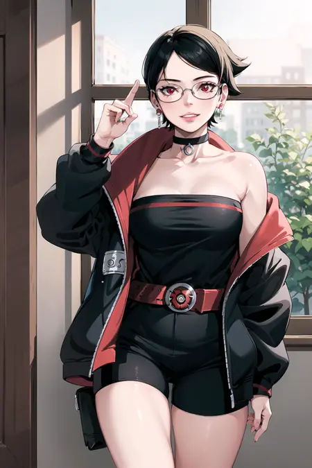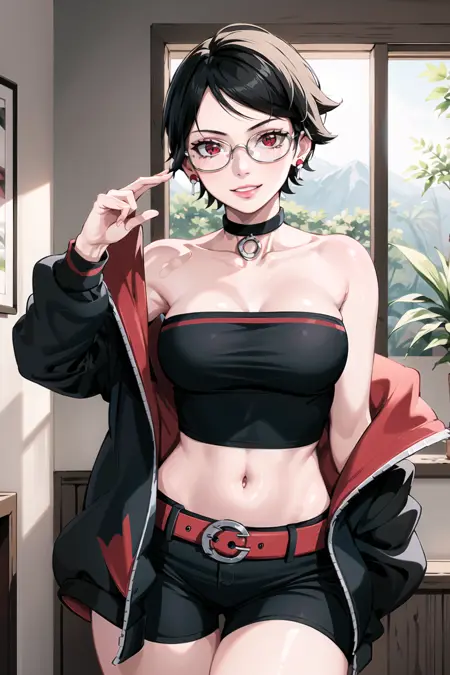 佐良娜,黑色眼睛,短发,眼镜,耳环,珠宝,衣领,O型环,露肩,锁骨,夹克,黑色短裤,袜子,腰带,露肩,敞开式夹克,黑色夹克,无吊带,大腿绑带,手插口袋,枪套,红色腰带,袜子,黑色鞋履,凉鞋,脚趾甲,厚底鞋,腿套,露趾鞋