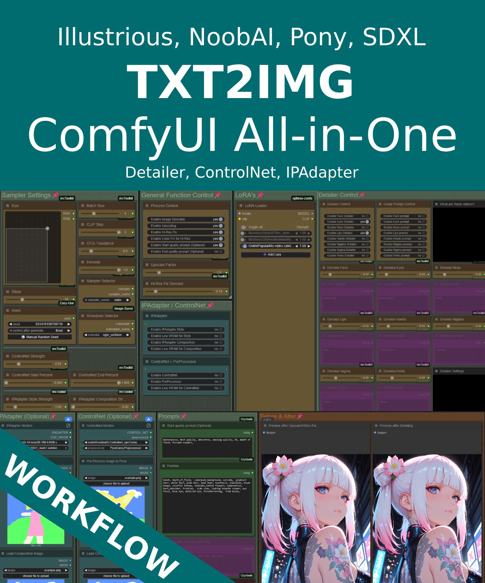 ComfyUI All-in-One, Detailer(ADetailer) + ControlNet + IPAdapter [Illustrious, Pony, SDXL]