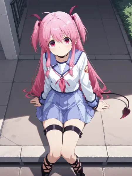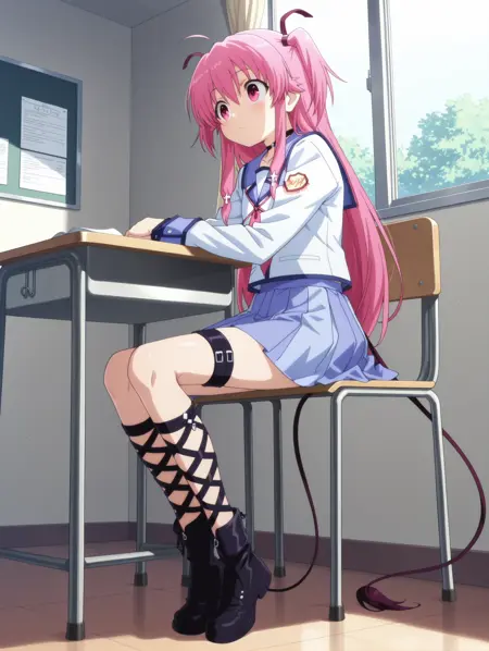 yui, long hair, pink hair, pink eyes, school uniform, shinda sekai sensen uniform, serafuku, choker, thigh strap, tail, cross-laced footwear, ankle lace-up