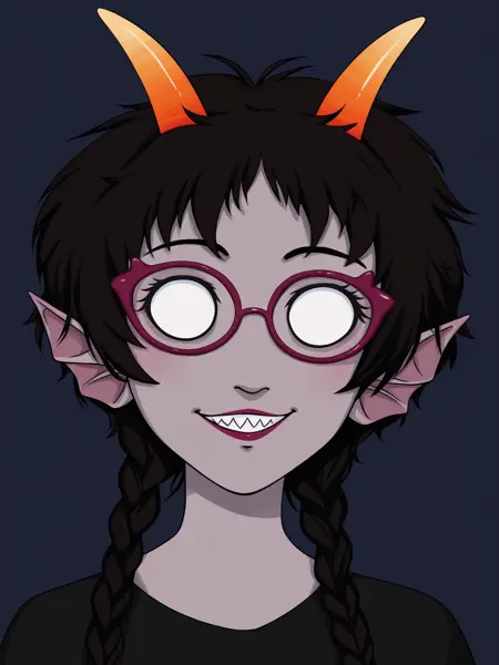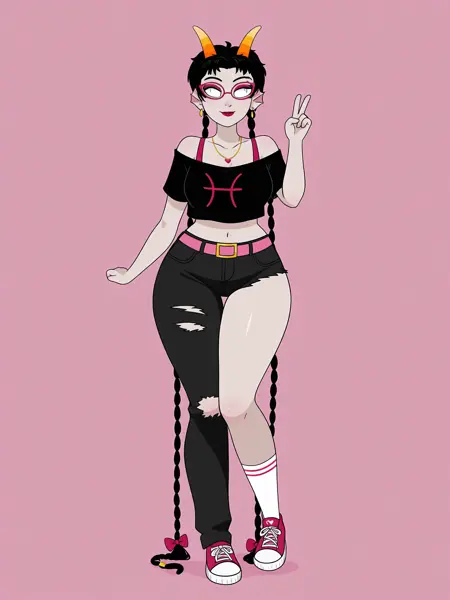 Relevant prompts: pisces print, grey skin, horns, black hair, twin braids, glasses, jewelry, white eyes, no pupils, yellow sclera, makeup, midriff, crop top, pants, black t-shirt, off shoulder, bra strap, panty straps, highleg