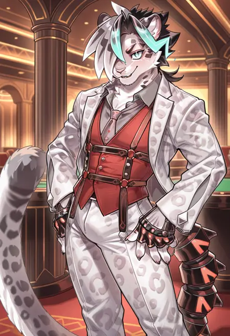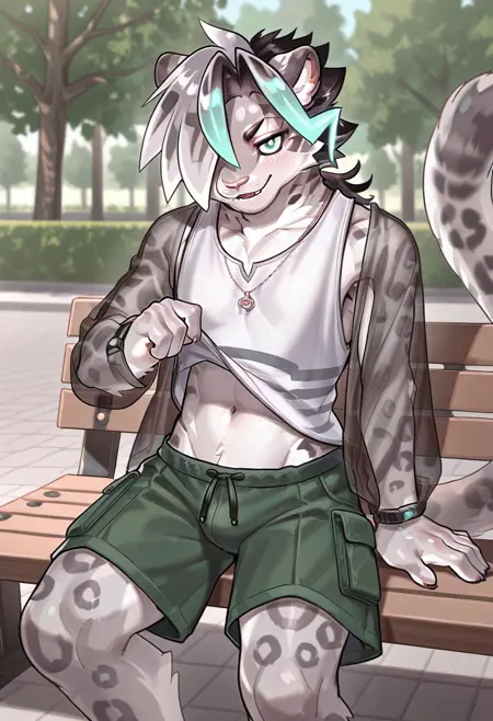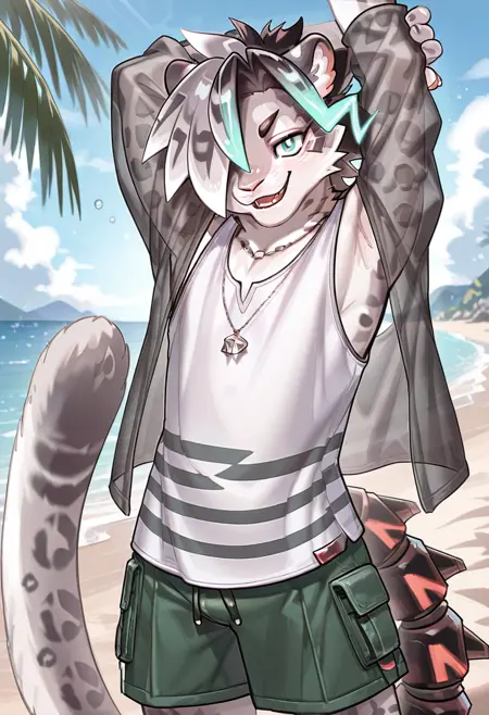 🖌️ Prompt: ra1z1,furry male,1boy,leopard boy,tail,hair over one eye,aqua eyes,aqua hair streak,grey fur,