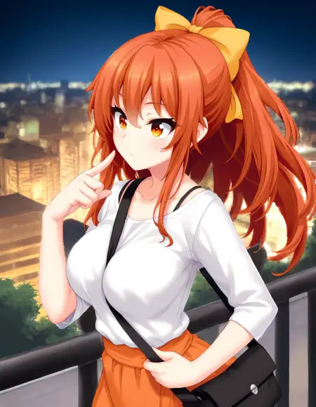 服装01,白色衬衫,长袖,锁骨,红色丝带领结,黄色开衫系于腰间,褶皱裙,灰色裙,荷叶边裙,