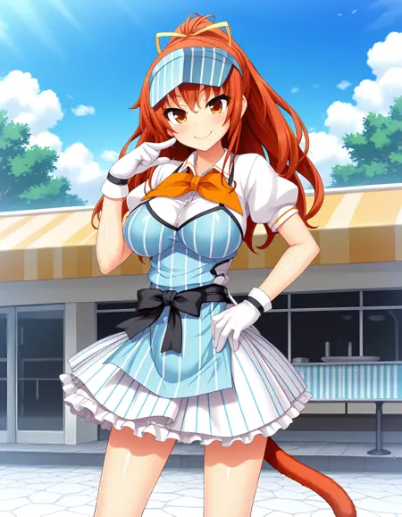 服装05,条纹遮阳帽,橙色线条装饰的白色衬衫,条纹围裙,腰带,系带条纹裙,白色手套,猫尾巴,