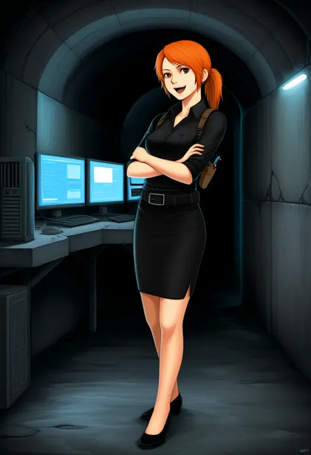 黑名单版本。“马尾辫”,如果模型不能自动处理,可能还需要加上橙色头发,她的默认服装为“黑色衬衫、黑色裙子、肩部枪套”。