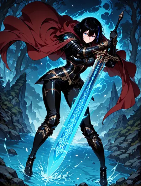 black armored boots, black armored armor, black corset, red cape, gauntlets, black gloves, black pants