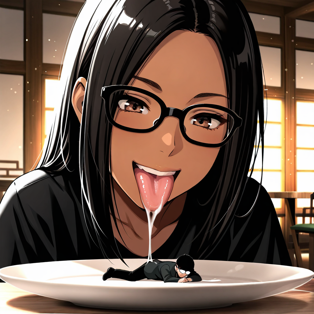 巨大な女性が縮小された人々をなめている、またはなめようとしているシーンを描写します。一般的なフォーマットは以下の通りです: