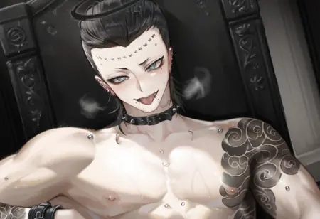WHBBelphegor, 1boy, male_focus, black_hair, slicked_back_hair, roman_numerals_tattoo, forehead_tattoo, right_white_eye, left_eye_double_iris, multiple_piercings, ear_piercings, helix_piercing, lobe_piercings, piercings_under_mouth, black_halo, neck_piercings, collarbone_piercings, chest_piercings, stomach_piercings, black_tribal_tattoo_on_arm, black_tribal_tattoo_on_shoulder, gray_briefs, bulge.