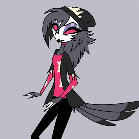 I found that this description helps make it generation better[ avian tail, long eyelashes, anthro owl, back length hair, small breast, helluvaboss, , owl-like demon, gray skin, avian furry, pink long-sleeved dress, high-heeled boots, gray fur, black panties, short black beak, black feathery cardigan, gray feathers, pink eyes, owl girl, solo, moderate ass, high-heeled boots, white mask-like face, light purple eyeshadow, black leggings, beanie}