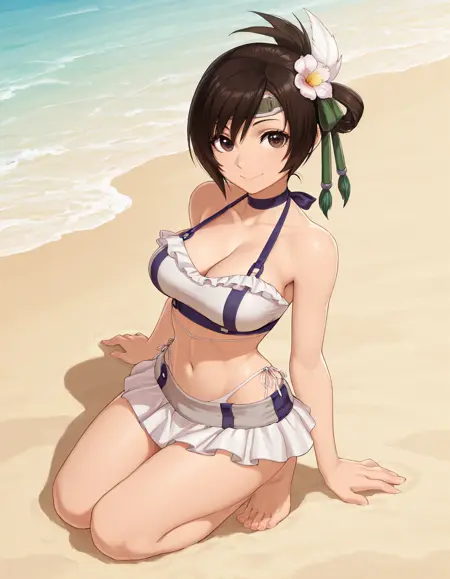 Shining Spirit outfit, white bikini, top, miniskirt, sandal, bow, hair flower, ponytail
