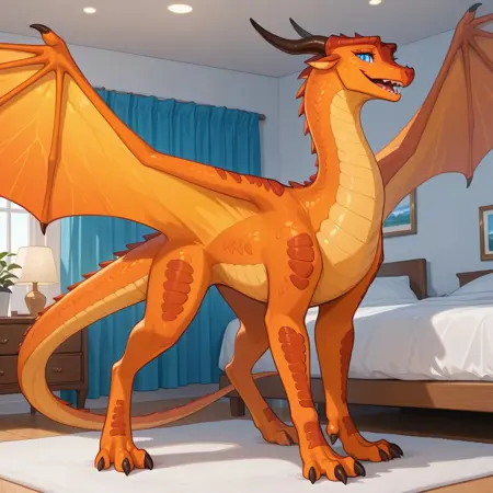 追加プロンプト:skywing, dragon, orange scales, wings, horn, blue eyes, tail, claws, 1girl