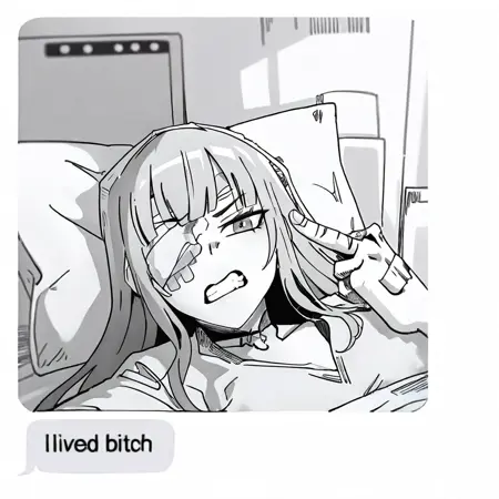 | 학습된 단어 | ilivedbitch, smile, parted lips, teeth, shirt, hospital gown, earphones, earbuds, indoors, hospital bed, bed, pillow, window blinds, lying, on bed, on back, looking at viewer, hand up, middle finger, selfie, upper body, english text, dialogue box, white border복사됨! ilivedbitch, smile, tongue, tongue out, :p, v-shaped eyebrows, bandaid, bandaid on face, bandaid on nose, hospital gown, hospital, indoors, hospital bed, bed, pillow, blanket, intravenous drip, on bed, lying, on back, looking at viewer, selfie, english text, w, dialogue box, white border,복사됨! ilivedbitch, monochrome, greyscale, teeth, clenched teeth, bandages, gauze, bandage over one eye, bandaged head, bandage on face, bandaged hand, bandaged fingers, bandaid, bandaid on hand, shirt, hospital gown, hospital bed, bed, pillow, blanket, lying, on back, on bed, looking at viewer, middle finger, selfie, english text, dialogue box, white border,복사됨! |