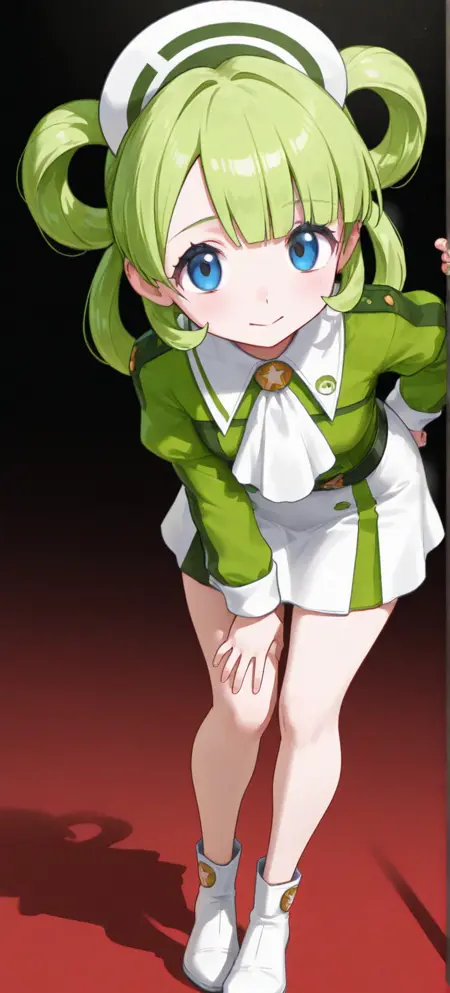 trinnia, trinnia \(pokemon\), green hair, blue eyes, hair rings, nurse cap, white headwear, green shirt, white ascot, puffy short sleeves, white skirt, ankle boots, white footwear