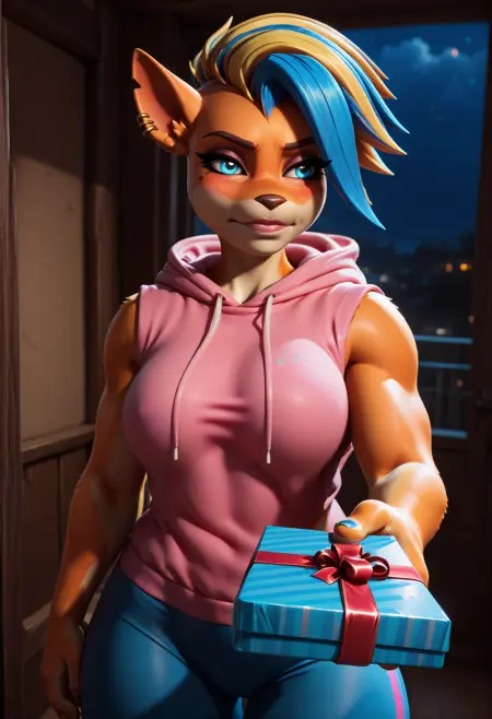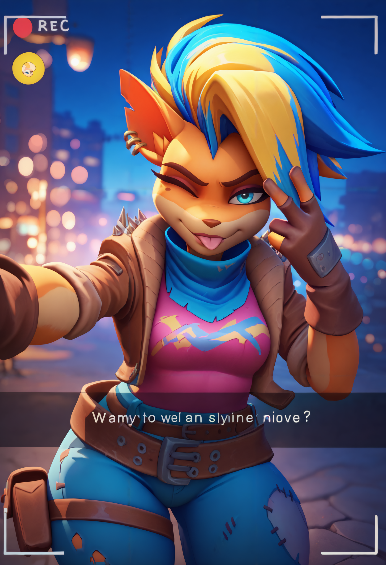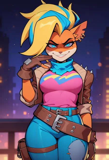 外观标签: 毛茸茸的女性,双色毛发,橙色毛发,白色毛发,双色头发,金色头发,蓝色头发,莫霍克发型,蓝色眼睛,吻突,多个耳环,眼下有痣