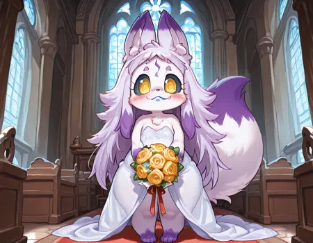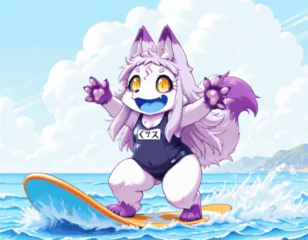 기본 프롬프트: 검은 공막, 노란 눈, 이마 문양, 송곳니, 긴 머리, 어지러운 머리, 흰 털, 보라색 털, 다채로운 털, 파란 입, 여우 귀, 여우 꼬리, 동물 발, 털 하이라이트, 넓은 골반, 두꺼운 허벅지, 배, 여우 발, 키타네, 케모노, 여우