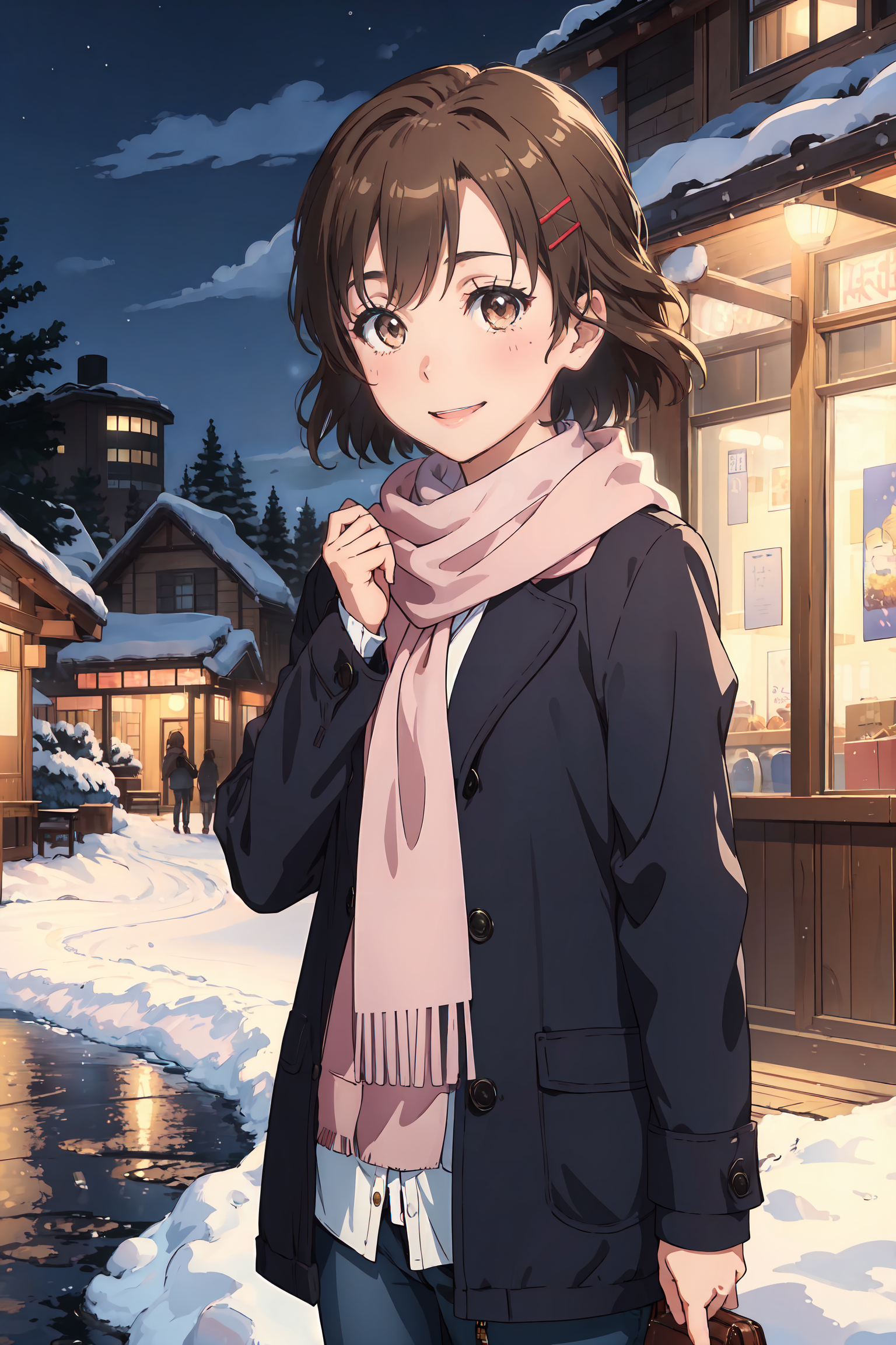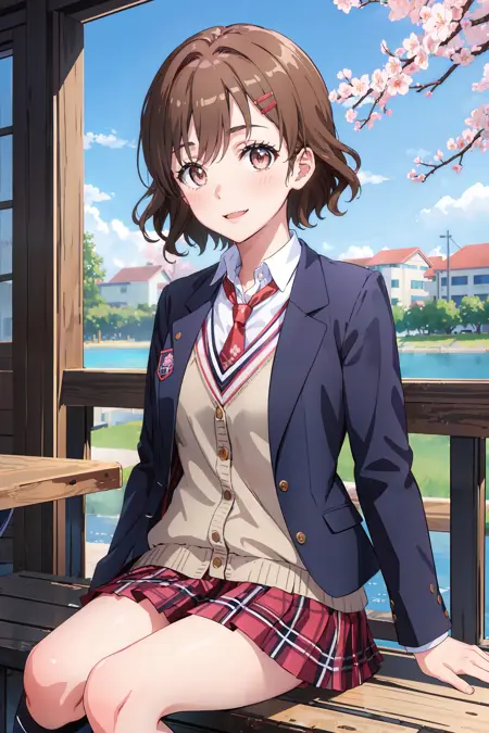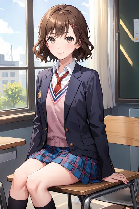 • 복장: 학교 복장, 파란 재킷, 벌어진 재킷, 넥타이, 체크 무늬 치마, 무릎높이 양말