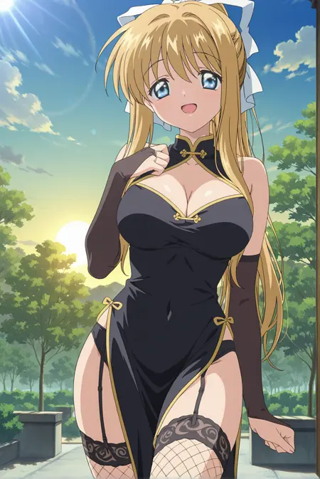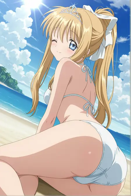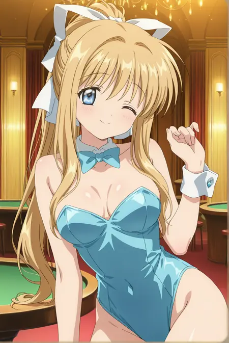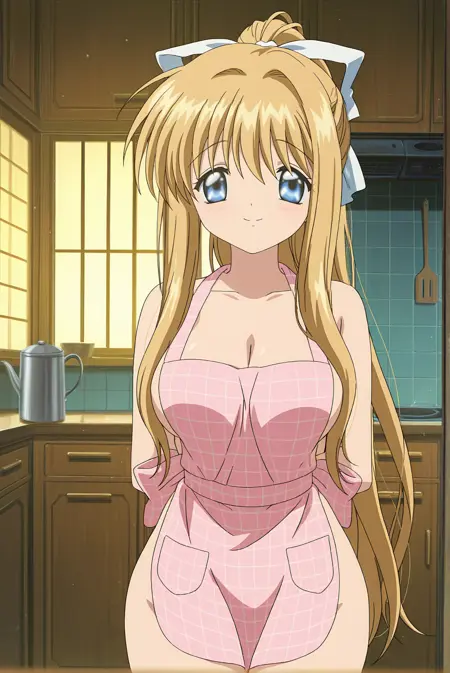 Basic: misuzu-ka, 1girl, solo, blonde hair, long hair, ponytail, hair ribbon, blue eyes, white ribbon,