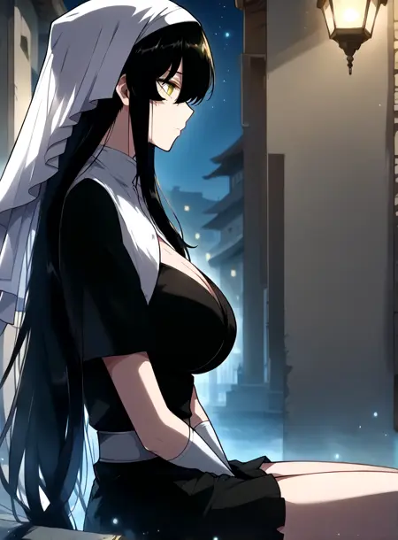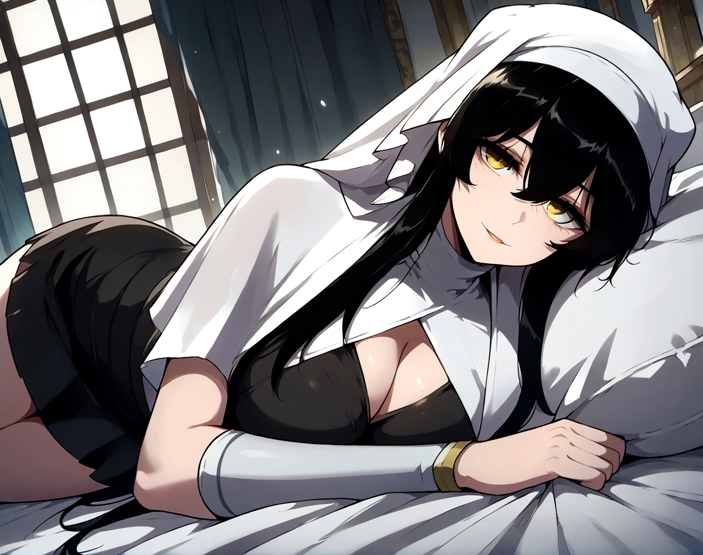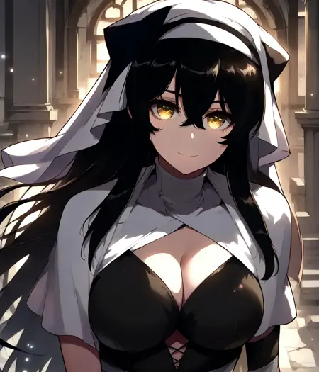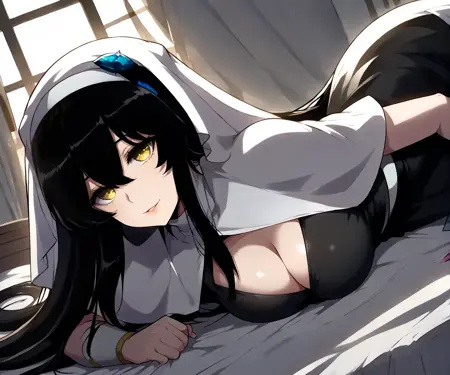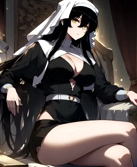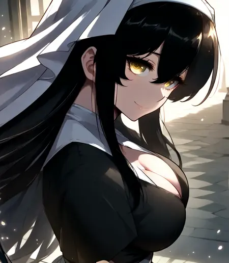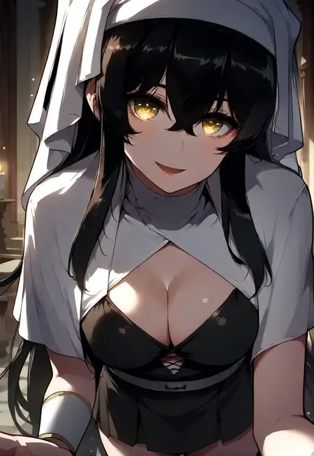big breasts, cleavage, nun, white veil, short skirt, knee boots