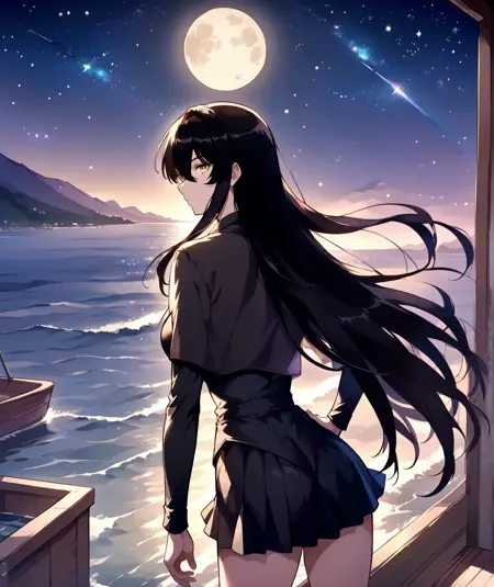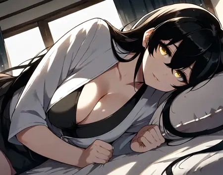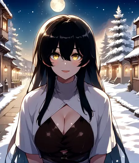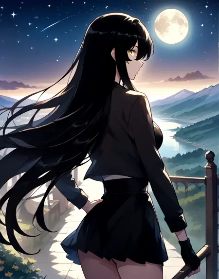 1 girl, solo, black hair, very long hair, loose hair, hair between the eyes, yellow eyes,