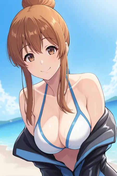 Some sample outfits include "diving suit, red and black bodysuit, white bikini, bikini top only, midriff, bare arms, front-tie bikini".