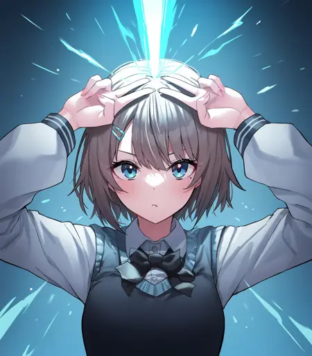 emerium pose, hands on own head, energy beam