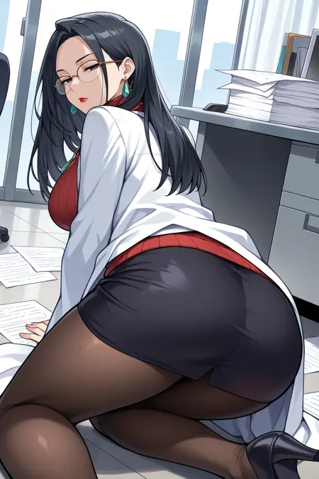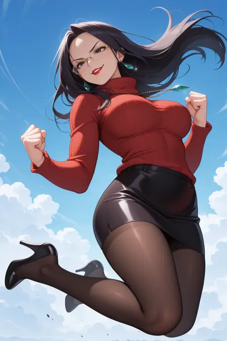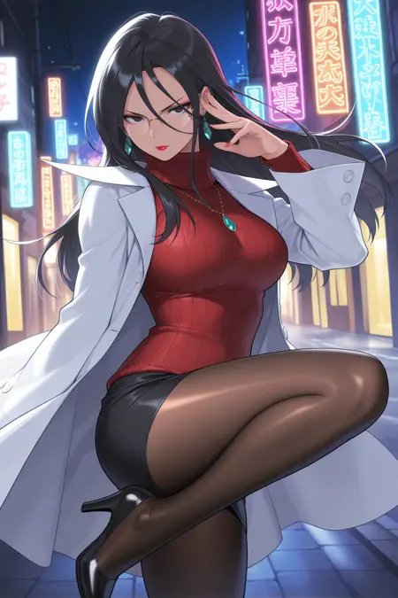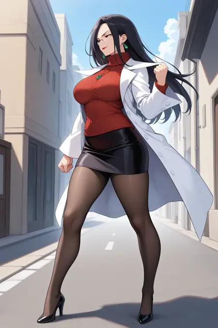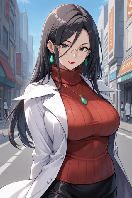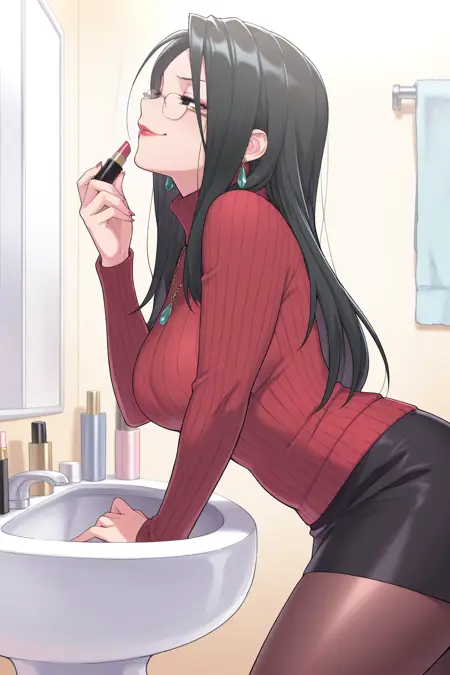 如需呈现她的典型造型,请添加 "口红、眼镜、耳环、项链、红色毛衣、高领、罗纹毛衣、黑色短裙、迷你裙、丝袜、实验服、黑色高跟鞋"。