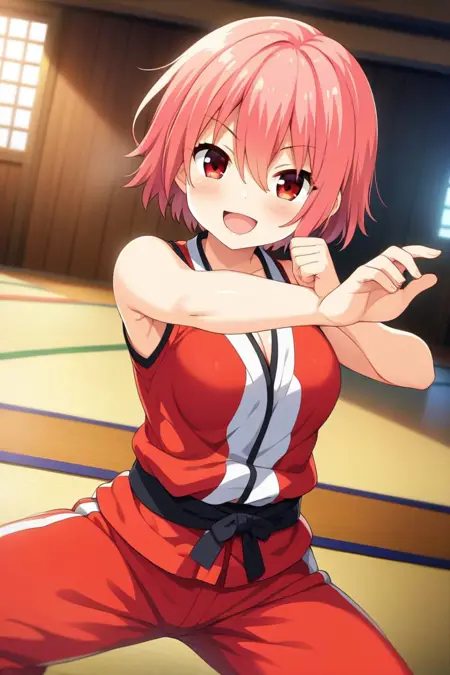 触发词:kumadakazuha,粉发,一缕头发遮住一只眼睛,耳环,短发,红眼