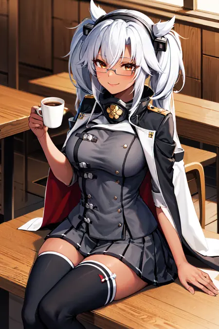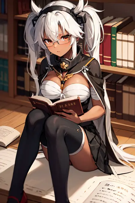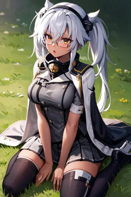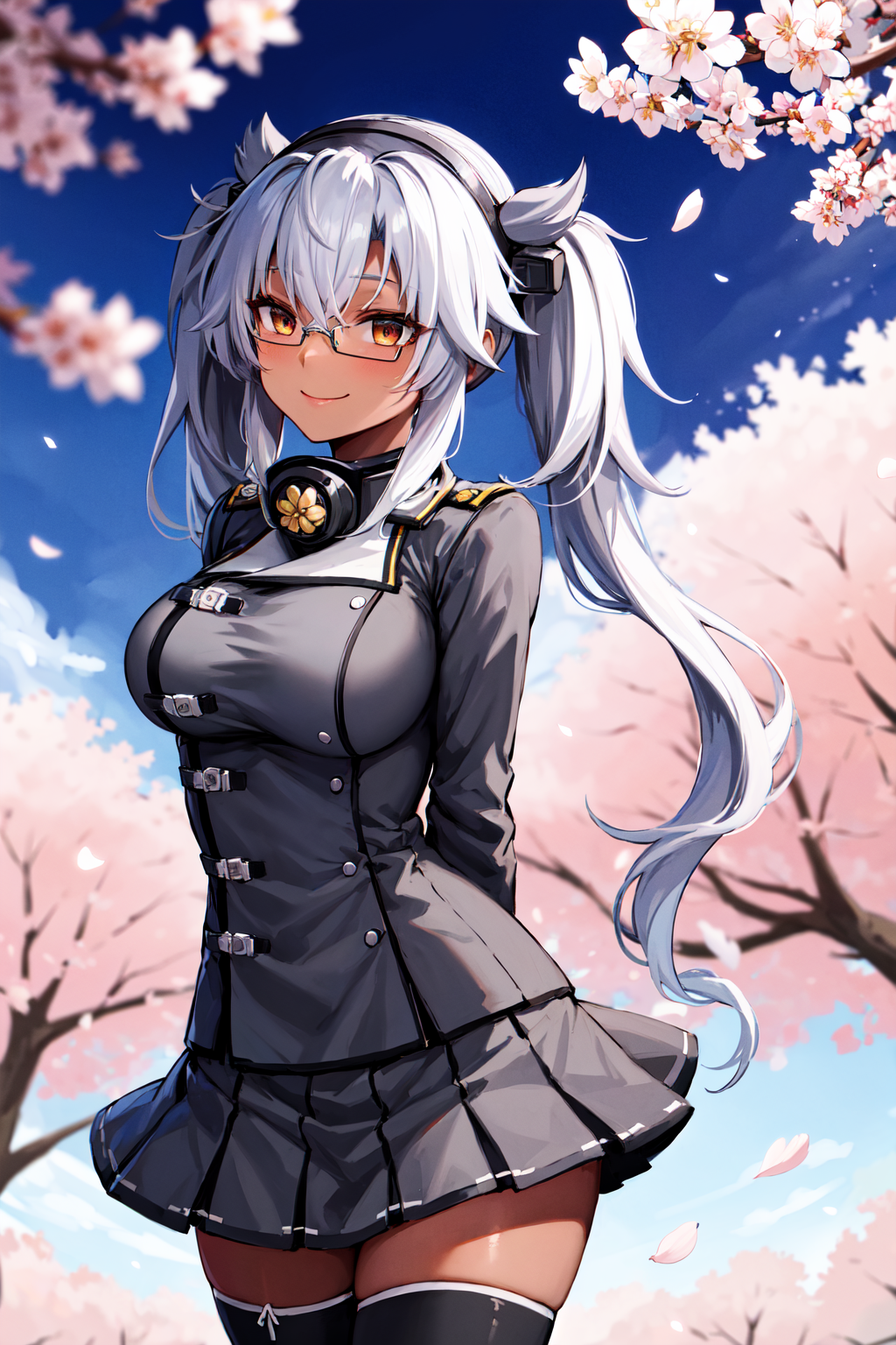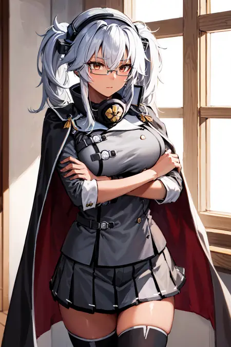 아우트핏3aamusashi, long hair, twintails, headgear, dark skin, glasses, cape, grey jacket, pleated skirt, grey skirt, black thighhighs