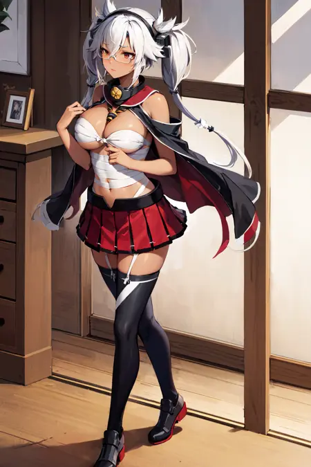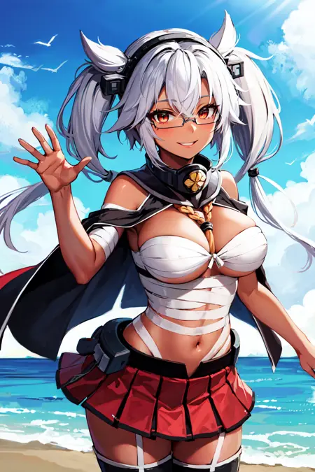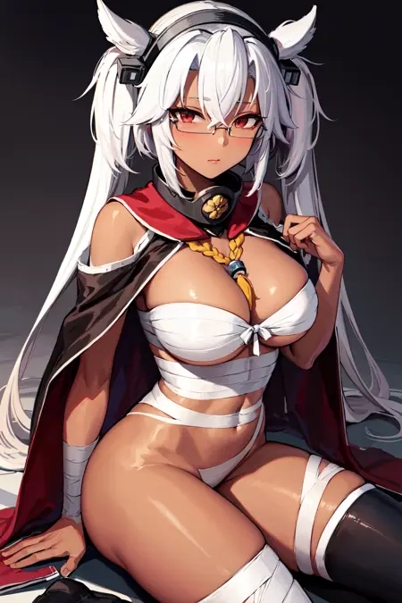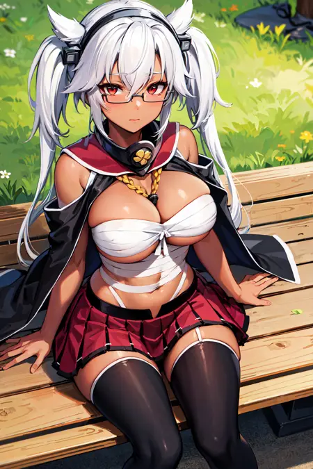 아우트핏1aamusashi, long hair, twintails, headgear, dark skin, glasses, capelet, bandages, sarashi, red skirt, pleated skirt, black thighhighs