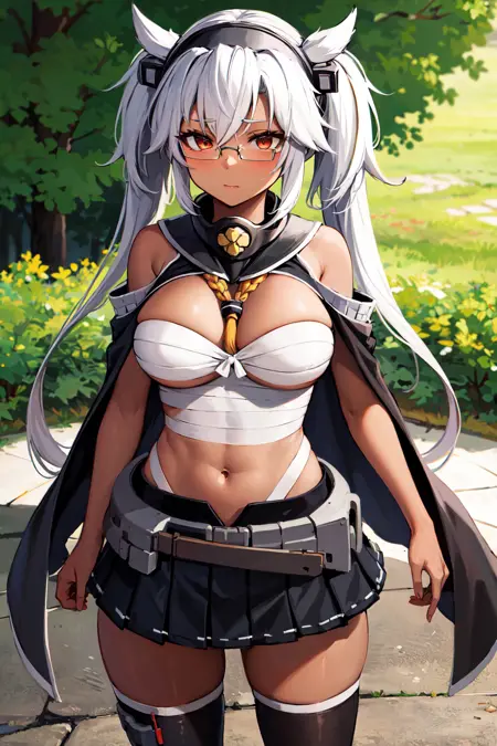아우트핏2aamusashi, long hair, twintails, headgear, dark skin, glasses, black capelet, bandages, sarashi, black skirt, pleated skirt, black thighhighs